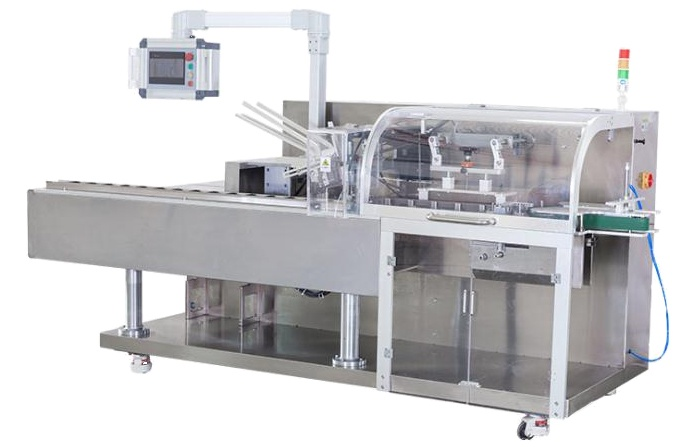 3)當(dāng)紙盒送到推料口處,將有(上、下、左、右)四處檔板將盒子撐開,讓產(chǎn)品順利推入紙盒內(nèi),如出現(xiàn)產(chǎn)品推不進(jìn)去的情況,機(jī)器則會自動停機(jī),起到保護(hù)機(jī)器及產(chǎn)品的作用。